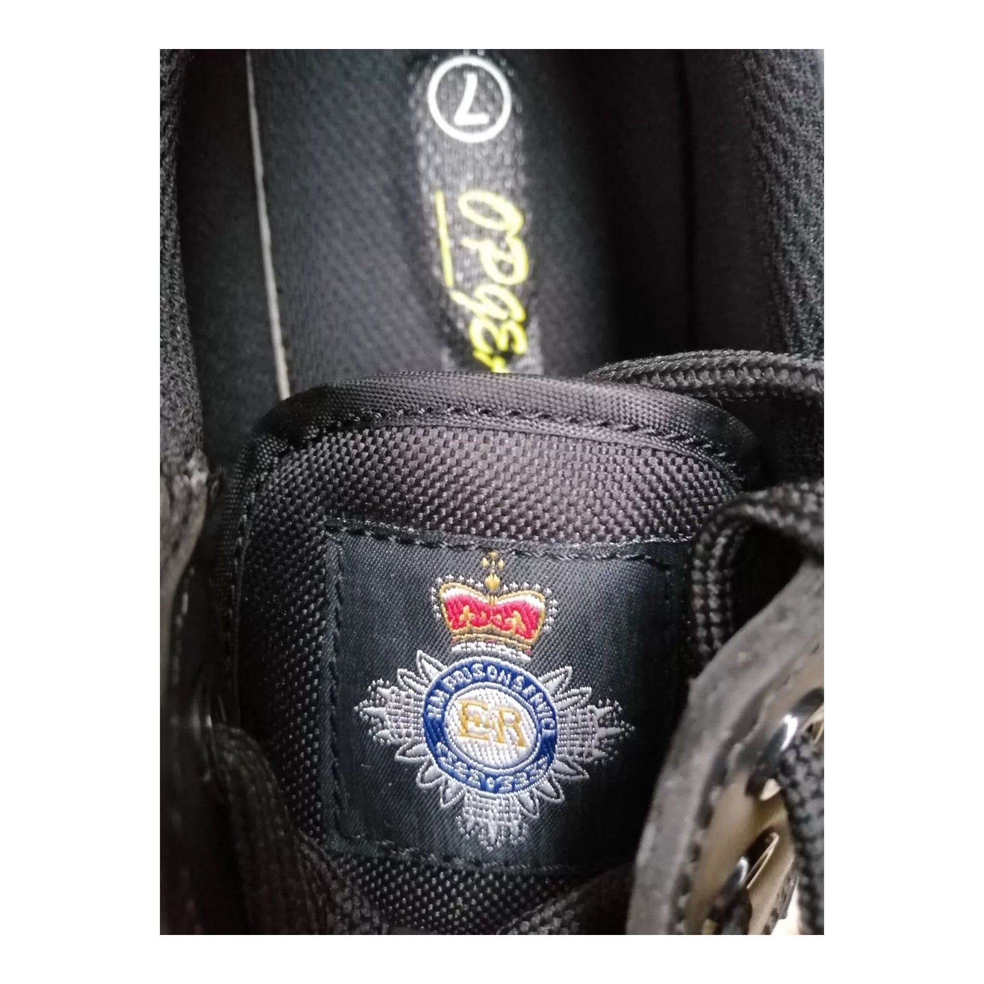 Supplier samples to the prison service with 'Size sample' stamped just in front of the laces